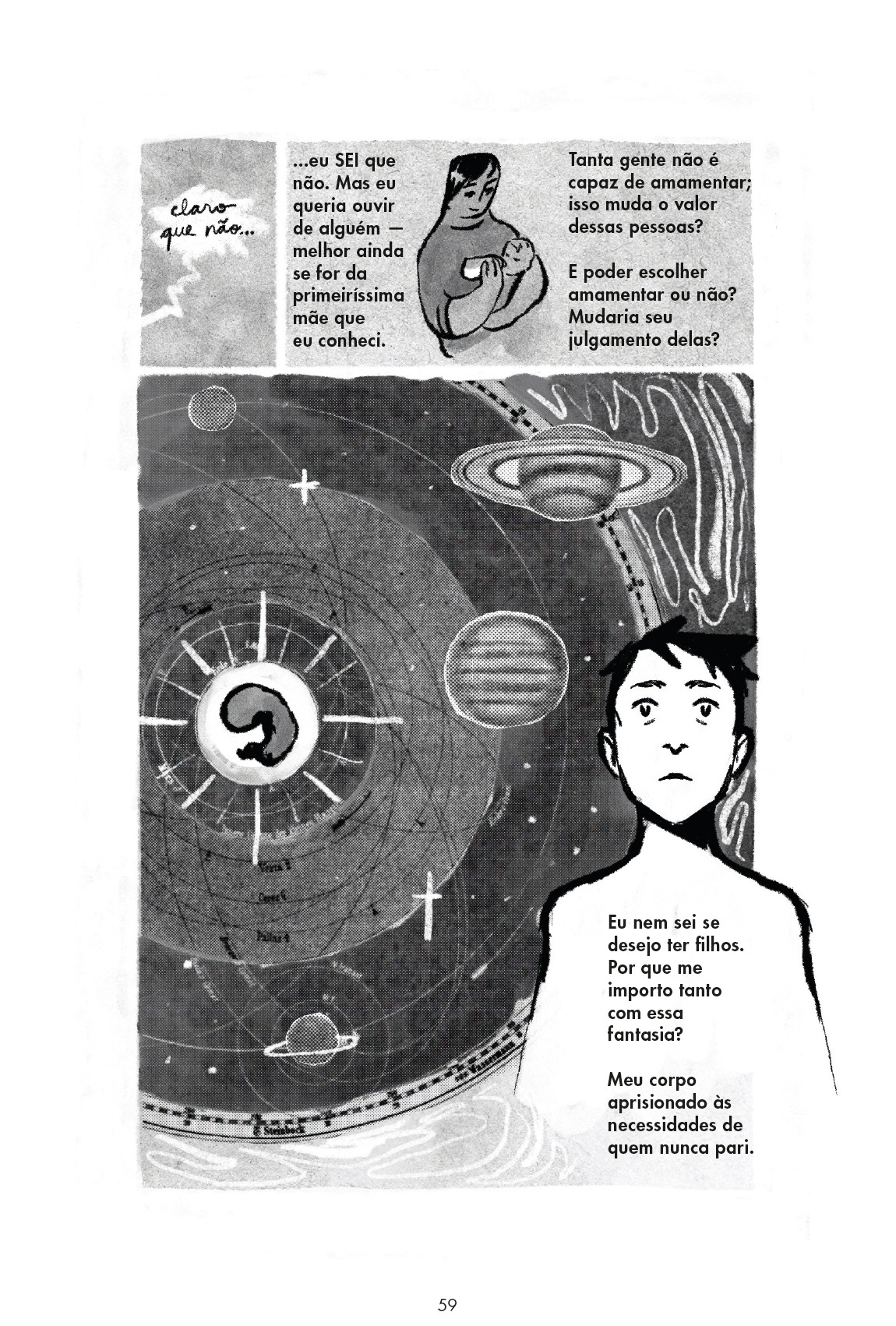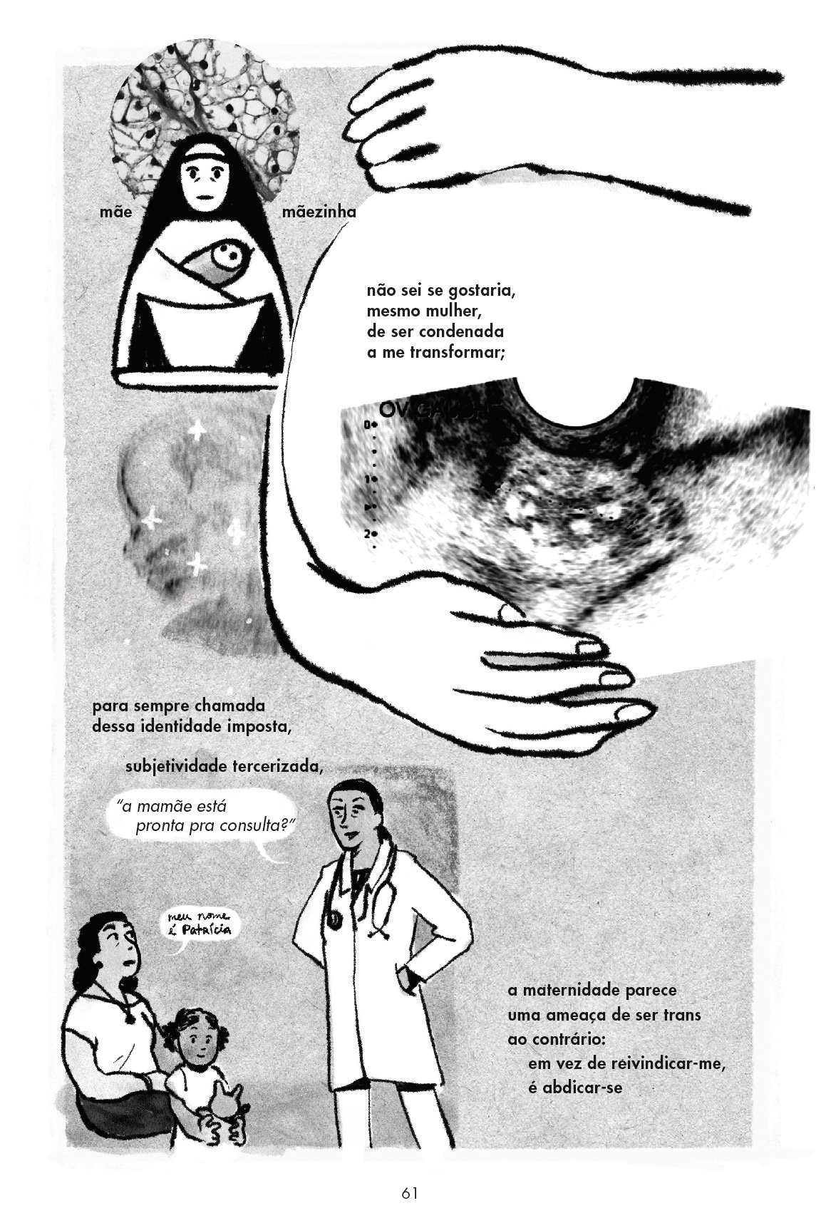 Falei que no quadrinho ela se retratava com várias dúvidas sobre o procedimento. Sobre o futuro, por exemplo: quando e se ele quiser ter filhos? Ele me contestou: