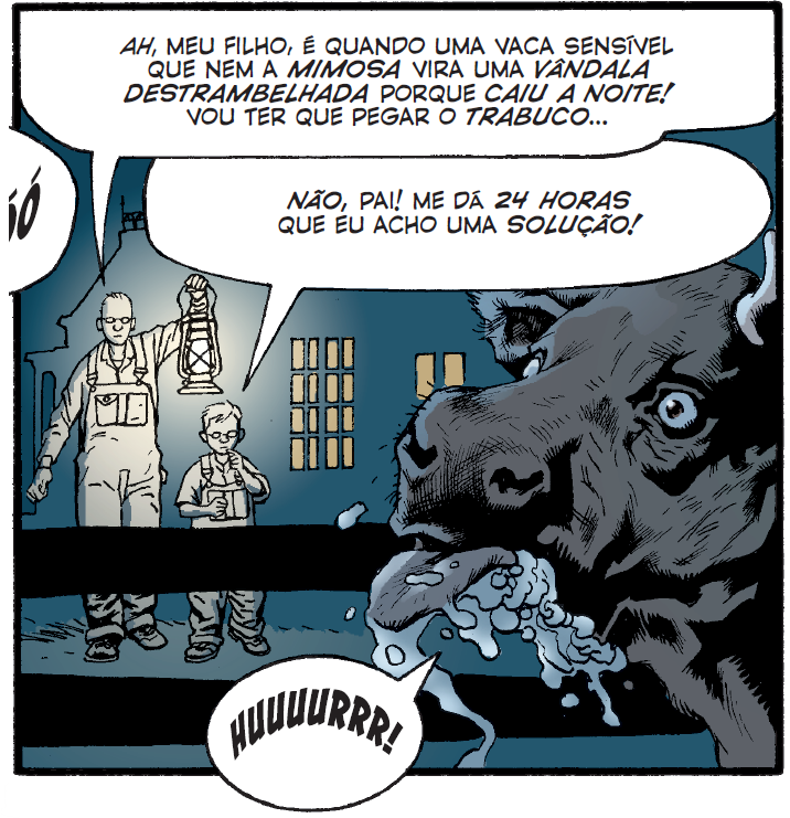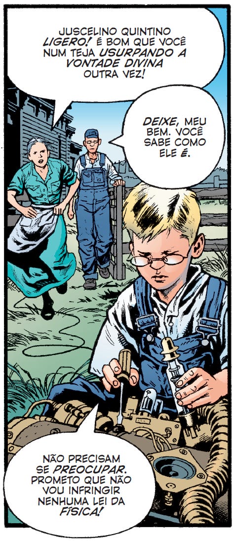 Traduzir nome de personagens não é uma coisa que eu costumo fazer, ainda mais quando é (quase) um nome próprio. Mas tenho justificativa, digamos, por causa do holístico da coisa: Tomorrow Stories é, na maior parte, uma obra de comédia. Um dos recursos de humor que Moore usa no texto está nos nomes próprios, que têm que suscitar o grotesco, a bobeira e, principalmente, o ridículo na cabeça de quem lê. No caso das histórias rurais do Juca Q. Ligero, os nomes originais têm referentes da roça dos EUA. Para chegar no mesmo efeito em quem lê em português, eles tinham que ganhar caipirice.