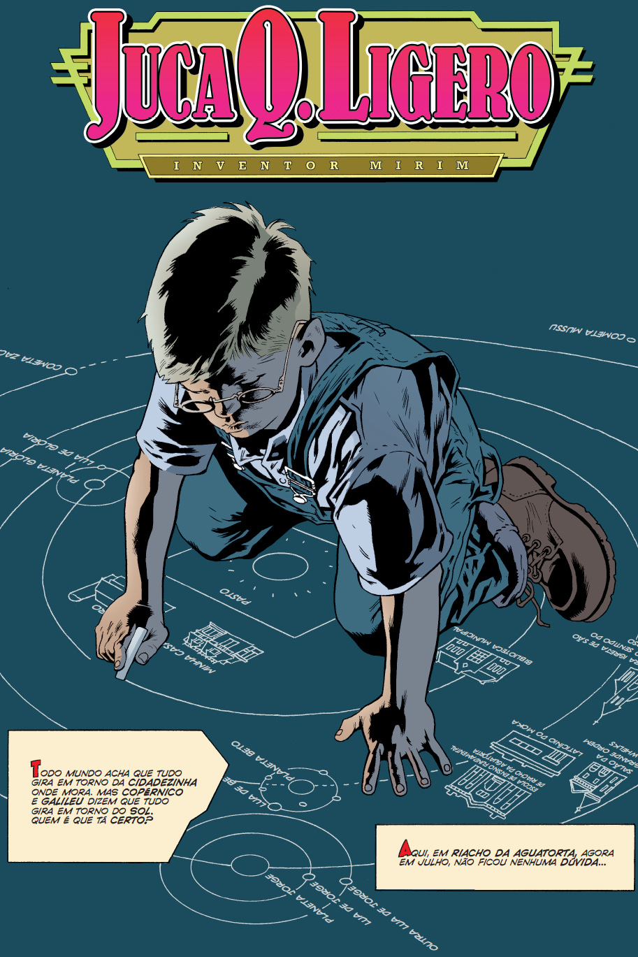 Juca é meu personagem preferido desde que eu li TOMORROW STORIES pela primeira vez, há vinte e tantos anos. Na primeira história, ele inventa um mini-sol porque a vaca do sítio fica louca quando cai a noite. Ele avisa a mãe: “Achei uma falha na teoria da relatividade de Einstein e acho que dá pra salvar a Mimosa.” Ele provoca o Big Bang, planetoides começam a se formar em torno do novo mini-sol e a rotação dos planetoides afeta a vidinha tranquila de Riacho da Aguatorta. Spoiler: acaba em um buraco negro.